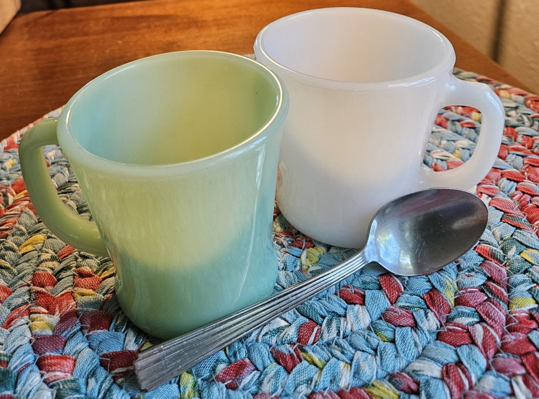 I have nice mugs, but the ones I use everyday are green-stamp cups from the 1950’s: one green, one white molded translucent glass. The heft is comfortable even when filled with liquid. The handle is balanced perfectly on the vessel, and because it’s mass produced, both are exactly alike except for color. They are easily cleaned. My finger joints don’t hurt after nursing a cup of coffee.